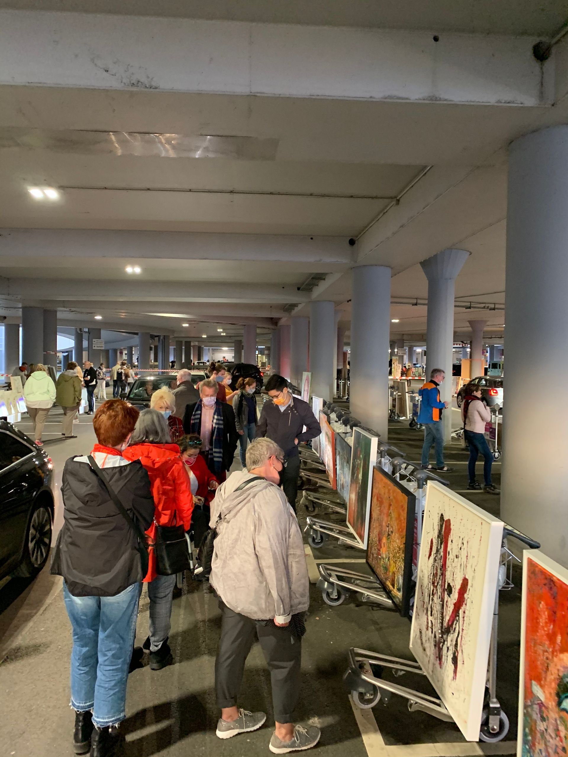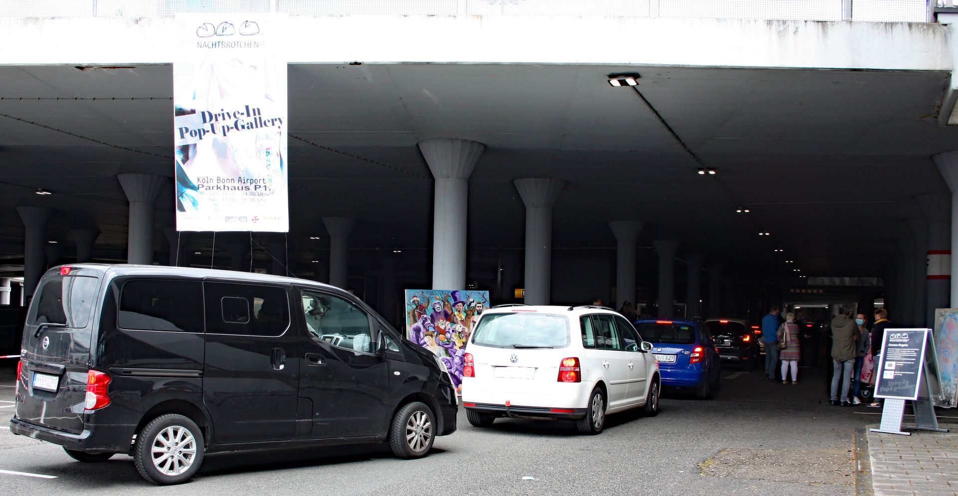 Ein Parkhaus auf dem Flughafen Köln/Bonn hat sich am Wochenende in eine Drive-In-Kunstausstellung verwandelt. Besucher konnten dort Werke aus dem Auto heraus besichtigen und die Kunst im wahrsten Sinne des Wortes „erfahren“. Die Veranstalter nutzten aus, dass das Parkhaus gleich gegenüber dem Terminal zurzeit wegen des stark zurückgegangenen Flugverkehrs großenteils leer steht. Die derzeitigen Abstands- und Hygieneregeln könnten dort gleichzeitig gut eingehalten werden, teilte der Flughafen mit.