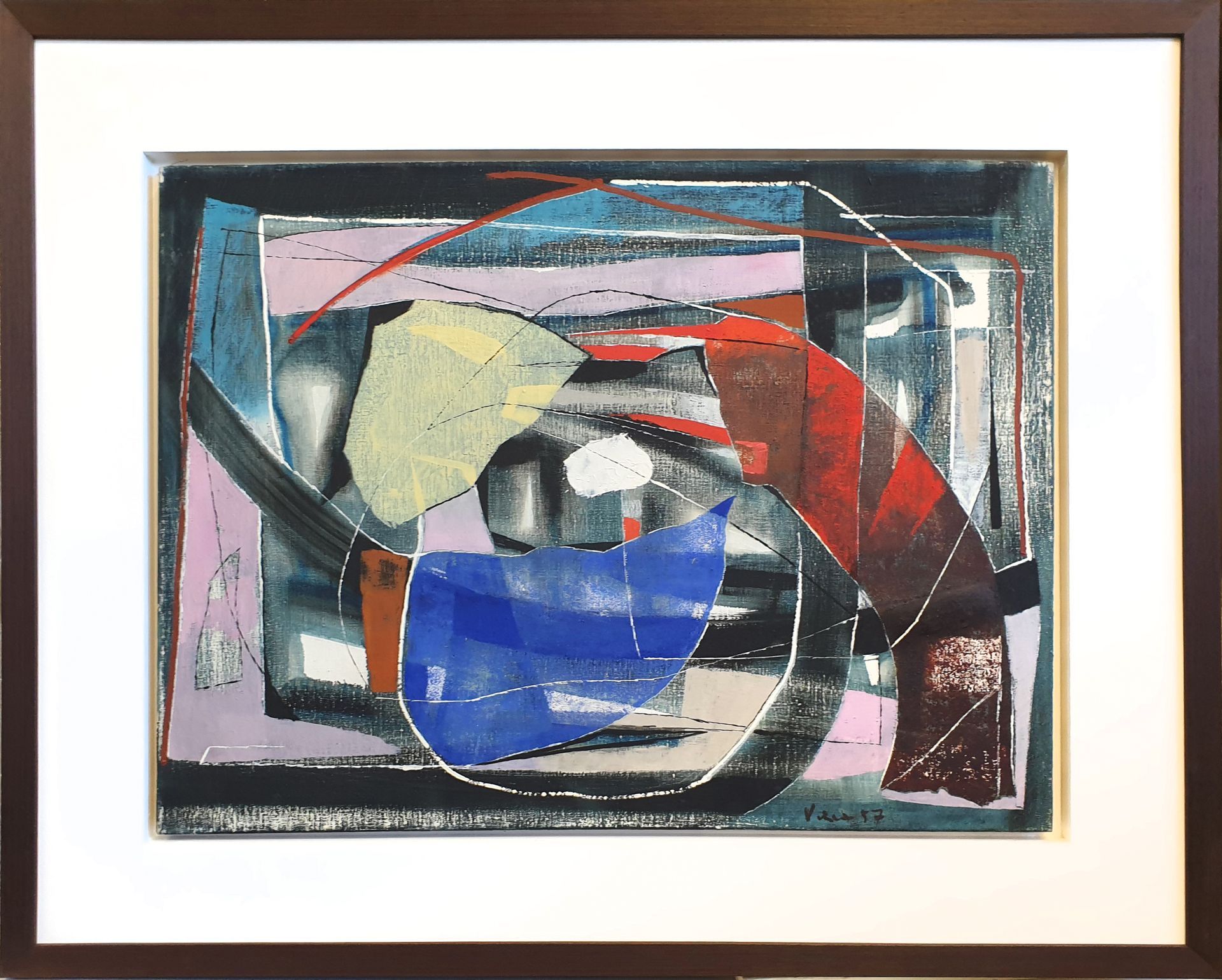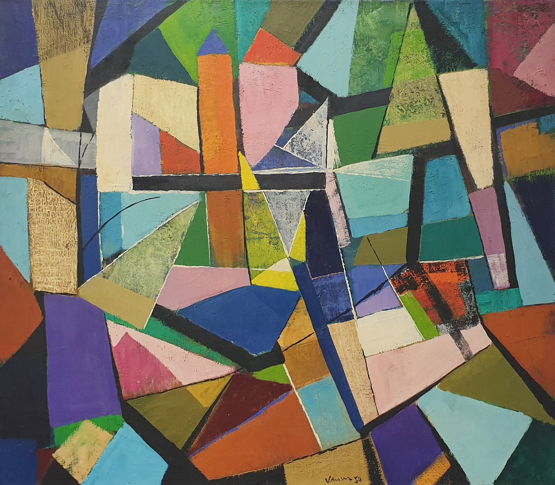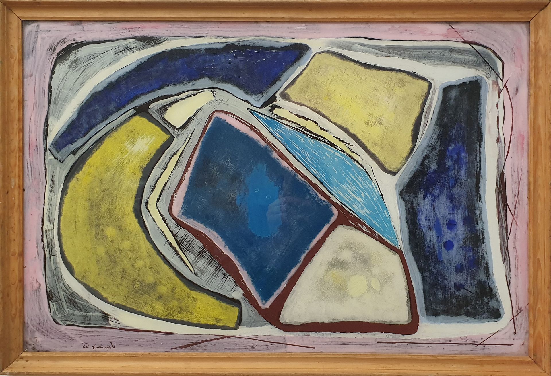 Es fehlt in anderen Bildern nicht an härteren Verspannungen, dunkle Töne treten auf, tragen Elemente der Bewegung in die Fläche des Bildes, auf der sich immer wieder bei allem Glanz im Malerischen eine strenge Ordnung des Gefüges kundtut. Allen Farben voran steht das Blau, das in vielen frühen wie späten Arbeiten beherrschend auftritt, ein großer Klang, rein und leuchtend. Zeitweise sieht man Hans Vincenz auch von der Empfindung für die Fläche bezwungen, für die Verspieltheit der Linien auf ihr, für die Kraft tektonischer Gerüste, die sich bis zum Massiven verdichten können. Doch spiegelt sich nirgends Härte wider, immer wieder begreift man die Freude des Malers an der sinnlichen Erscheinung, an der Harmonie des Gesamten, wie auch an der Vollendung im Handwerklichen, das, obwohl sicherer Besitz seit Jahrzehnten, doch stets neu erprobt und in Frage gestellt wird. Im Medium der Farbe erschließen sich weiteste Bereiche, manchmal scheinen hinter den Verspannungen der Formen und lichten Flächen Reminiszenzen an Dingliches zu erwachen, nicht mehr im Sinne eines Abbildes, sondern einer neuen, rein malerischen Gegenständigkeit. Man ist versucht, sich in Weiten zu verlieren, geträumte Landschaft zu erleben im empfindsamen Verschweben zarter Farbklänge.